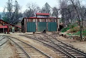In 1972, Fiberboard Corporation (which owned Pickering Lumber Company) transferred the railroad to another subsidiary, Trimont Land Company, with the rationale that the property might be suitable as a real estate development. The plan to carve up the property did not come to fruition, and in 1976, the railroad was sold to Glen Bell, the founder of the Taco Bell restaurant chain, who invested over $10 million in the railroad.[7] This 3 ft (914 mm) gauge railroad used the lower section of the track and several steam locomotives of the West Side Lumber Company railway. The operation also offered boat rides on the old mill pond and RV parking. The theme park/railroad did not attract the anticipated number of visitors, and in 1981, Bell sold the 340-acre property to Henley Management Company for less than $500,000 and the railroad was shut down. In 1986, Quality Resorts of America bought it from Henley, and converted the property into an RV park, with limited railroad service. It sold off much of the rolling stock to other railroads, such as the Yosemite Mountain Sugar Pine Railroad, the Roaring Camp & Big Trees Narrow Gauge Railroad and the Nevada County Narrow Gauge Railroad Museum. Today, the railroad is no longer in operation, but part of the right-of-way is a hiking trail.[8][9][10][11][12]