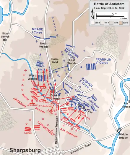 While the I Corps under Maj. Gen. Joseph Hooker advanced on the Confederate left, Maj. Gen. Edwin V. Sumner's II Corps remained east of Antietam Creek awaiting orders. After a delay (attributed by some sources to Maj. Gen.George B. McClellan's unavailability, though contemporaneous accounts differ), Sumner personally led Sedgwick's division across the creek around 9:00 a.m. Following a briefing near the East Woods, Sumner ordered Sedgwick's division to advance across the Hagerstown Pike into the West Woods. The division advanced in three brigade lines. Postwar analysis suggested Sumner sought to exploit earlier Union gains before Confederate forces could regroup.[3]