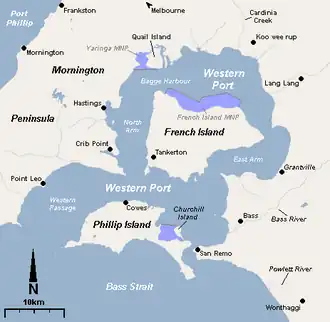 Western Port, (Boonwurrung: Warn Marin) commonly but unofficially known as Western Port Bay, is a large tidal bay in southern Victoria, Australia, opening into Bass Strait. It is the second largest bay in the state. Geographically, it is dominated by two large islands; French Island and Phillip Island. At the time it was renamed, its position was west of other known ports and bays, but Western Port has become something of a misnomer as it lies just to the east of the larger Port Phillip and the city of Melbourne. It is visited by Australian fur seals, whales and dolphins, as well as many migratory waders and seabirds. It is listed under the Ramsar Convention as a wetland of international significance.[2]
