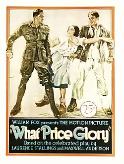 What Price Glory? is a 1926 American synchronized sound comedy drama war film produced and distributed by Fox Film Corporation and directed by Raoul Walsh. The film was released with a synchronized musical score with sound effects using the Movietone sound system. The film is based on the 1924 play What Price Glory by Maxwell Anderson and Laurence Stallings and was remade in 1952 as What Price Glory starring James Cagney.[2][3] Malcolm Stuart Boylan, founder of the U.S. Coast Guard Auxiliary, was title writer on the silent Fox attraction.[4]