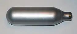 A whipped cream charger (colloquially called a whippet, nos or nang when used recreationally[1]) is a steel cylinder or cartridge filled with nitrous oxide (N2O) that is used as a whipping agent in whipped cream. The narrow end of a charger has a foil covering that is broken to release the gas. This is usually done by a sharp pin inside the whipping siphon.