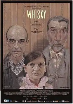 Whisky is a Uruguayan tragicomedy film directed by Juan Pablo Rebella and Pablo Stoll and released in 2004.[1] The film stars Andrés Pazos, Mirella Pascual, Jorge Bolani, Ana Katz, and Daniel Hendler. It has sparse dialogue and the three principal actors play very rigid roles depicting little emotion. It was premiered at the 2004 Cannes Film Festival where it won the Un Certain Regard and FIPRESCI Awards.[2] It was Rebella's last film as he died in 2006, two years after the release of the film.