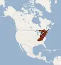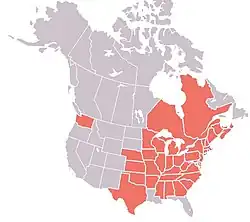 The disease was first reported in January 2007 in New York caves,[20] although it was retrospectively detected in a photograph taken in early 2006. It spread to other New York caves and into Vermont, Massachusetts, and Connecticut by 2008.[46][47] In early 2009, it was confirmed in New Hampshire,[48] New Jersey, Pennsylvania,[49] Virginia,[50] West Virginia[46] and in March 2010, in Ontario Canada, Maryland,[51] Middle Tennessee, Missouri,[52] and Quebec, Canada.[53][54] In 2011, the syndrome was confirmed in Ohio,[55] Indiana,[56] Kentucky,[57] North Carolina,[50] Maine,[58] New Brunswick and Nova Scotia.[59] In the winter of 2011–2012, Alabama,[27] Delaware[60] and Arkansas[61] confirmed the disease in bats and new cases showed up in northeastern Ohio,[62] and Acadia National Park in Maine.[63] Confirmed cases appeared in 2013 in Georgia,[64] South Carolina,[65] Illinois,[66] and the Canadian province of Prince Edward Island.[67] In March, 2014, WDNR and USGS staff conducting routine surveillance detected white-nose syndrome in a single mine in Grant County Wisconsin and the USGS National Wildlife Health Center later confirmed the disease.[68] In April, 2014, the Michigan Department of Natural Resources announced that the disease had been found in Alpena County, Mackinac County, and Dickinson County.[69] In May, 2014, after retesting, the Myotis velifer specimen from Oklahoma and other swabs and samples from the area tested negative, and Oklahoma and Myotis velifer were removed from the list of WNS suspects.[70]