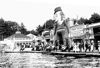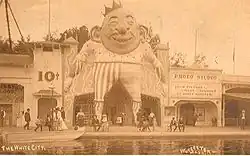 ![]() White City in 1908. The colossal figure of "King Dodo" guards the entrance to the fun house. | |