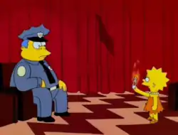 Homer's escape from the overturned paddy wagon is an homage to the 1993 film The Fugitive.[1] Chief Wiggum's dream in which Lisa speaks backwards is, as mentioned above, a reference to Special Agent Dale Cooper's interaction with the Man from Another Place.[1] While recording Lisa's lines for the segment, Yeardley Smith recorded the part backwards; the recording was in turn reversed using phonetic reversal, the same technique used on Twin Peaks itself.[8] Several other parts out of the segment are direct references to the dream, including a moving shadow on the curtain, and Wiggum's hair standing straight up after waking.[11]