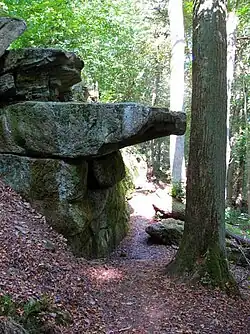 The so-called Wichtelhöhlen (Bad Kissingen) — goblin caves — are a rock formation with small caves located near Bad Kissingen in Lower Franconia in the center of Germany. The formation of nearly 20 sandstone rocks in the valley of the Fränkische Saale dates back to the early Triassic period.