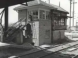 The station's original signal box, described as a "Type EO", was replaced with a "Type O" design signal box in 1966. Accessible from Station Street to the station's north, and through a metal staircase at the eastern end of Platform 2, the signal box was a two-storey high brick building, with a "terracotta tiled hipped roof and aluminium framed windows". The lower floor was primarily used for surveillance of the level crossing at Stewart Avenue, using a closed-circuit television link between the box and the level crossing.[8] A precast reinforced concrete footbridge crossed the tracks at the station's eastern end, allowing easy access for commuters between the platforms. The footbridge is relatively modern, having been built in 1992, with access between the platforms in the 56 years previous only existing through the station's entrances on Beresford Street and Station Street, respectively.[8]
