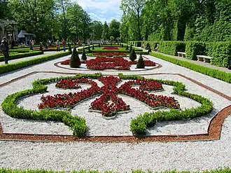 An integral part of the palace, almost since its beginning, is the garden. Initially, it had the character of a baroque Italian garden in a semicircular form surrounding the palace on the east. In its composition this geometric garden fitted in well with the ancient patterns and the palace arrangement. It consisted of an upper garden located on a terrace with two arbours in the form of lanterns in each corner, and lower garden. During the third stage of the reconstruction of the palace the geometric garden parterres were replaced with embroidered parterres à la française inspired by André Le Nôtre's works.[31] At that time the garden was embellished with gilded lead sculptures by Gaspar Richter of Gdańsk and vases carved in cherry marble from Chęciny.[32] In the beginning of the 18th century the garden was enlarged, the late baroque parterre ornamentation was replaced with Régence motives completed with Sieniawska's coat of arms Szreniawa in the northern parts and her monogram in the southern part.[28] In 1784 Izabela Lubomirska transformed neighbouring territories of Wilanów folwark into a jardin anglo-chinois according to Szymon Bogumił Zug's design. This new garden with rich vegetation, sinuous paths and cascades was inspired by works of William Chambers, Thomas Whately and August Moszyński.[33]