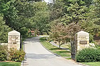The cemetery was founded in 1851 and added to the National Register of Historic Places in 1989. This cemetery was established using part of the $3000 gift from Colonel William P. Winchester that was donated on condition that the town be named after him.[2] It was one of the first public spaces laid out after Winchester was incorporated,[3] on land just west of the former Middlesex Canal.[4] It is laid out in the rural cemetery fashion popular in the mid-19th century, with winding lanes a country landscaping. The designer was Amasa Farrier of neighboring Stoneham, who used as his inspiration the published works of Andrew Jackson Downing and John Claudius Loudon. Land was purchased in 1851, and was ready for use the following year. Older graves from the small cemetery at the First Congregational Church were transferred here in 1853. As a result, the oldest dated burials are in 1805. The entrance gateway was added as part of a landscape design developed by the Olmsted Brothers in 1937.[3]