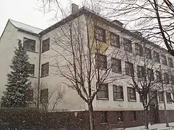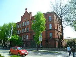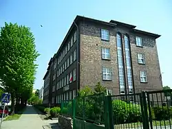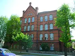 The school building at 6 Wileńska Street, initiated by Adolf Kaschny, was completed in stages, first in 1932 and fully by 1 April 1934. Initially, it housed three vocational schools: the Crafts Vocational School (Gewerbliche Berufsschule), the Merchant School (Kaufmännische Berufschule), the School for Pharmacists (Drogistenfachschule), as well as the Higher Commercial School (Höhere Handelsschule) and the Municipal Commercial School (Städtische Handelsschule).[2][15][16] The building was equipped with an air-raid shelter, and in 1944, a lazaretto was established there.[2] Toward the end of World War II, one corner of the building was destroyed by a bomb. On 24 June 1945, the Polish authorities took over the building, and classes resumed as early as 15 October that year. On 1 September 1946, a carpentry class and two additional vocational training classes were launched. Over the years, many types of schools operated in the building.[31] Currently, it houses Technical School No. 2, Supplementary Technical School No. 2 for Adults, Vocational School No. 2, and Post-Secondary School No. 2.[32] The school also includes a gymnasium built in 1894, which originally served as the town's sports hall before the school's establishment.[10][15][16]
