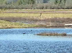 The Portland/Vancouver Basin ecoregion (named for the cities of Portland and Vancouver) is a geological depression at the base of the Portland Hills fault-block. It contains the confluence of the Willamette and Columbia Rivers and is composed of deltaic sands and gravels deposited by Pleistocene floods, notably the Missoula Floods. Elevation varies from 0 to 300 feet (0 to 90 m), with buttes as high as 650 feet (200 m). Historically, the basin was characterized by Oregon white oak groves and Douglas-fir forests on the uplands; black cottonwood groves on riverbanks and islands; Oregon ash, red alder, and western redcedar in riparian areas; and prairie openings maintained by Native American burning, with camas, sedges, tufted hairgrass, fescue, and California oatgrass. Numerous wetlands, oxbow lakes, and ponds can still be found, but today the region is dominated by urban and suburban development, pastures, cropland, and tree farms. The climate is usually marine-influenced, but easterly winds from the Columbia River Gorge periodically bring continental temperature extremes. The region covers 305 square miles (790 km2) in Washington and 269 square miles (697 km2) in Oregon, including the northern and eastern suburbs of the Portland metropolitan area. It contains several National Wildlife Refuges within the Ridgefield National Wildlife Refuge Complex.[2][3]