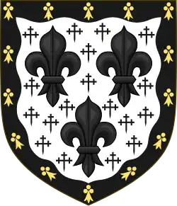Argent semee of cross crosslets fitchee three fleurs-de-lis two and one Sable within a bordure wavy Pean.