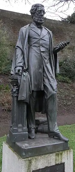 A bronze statue was made of the Earl by the Exeter sculptor Edward Bowring Stephens[4] and in October 1880[5] was erected at the front of the central garden in Bedford Circus, Exeter, on the spot where Stephens' "The Deer Stalker" had formerly stood. (The latter statue now stands near the Earl's statue, both having been re-located in Northernhay Gardens). The unveiling ceremony was attended by Sir Stafford Northcote (1818–1887), later Lord Lieutenant of Devon 1886–7, (whose own statue in Northernhay Gardens now stands nearby) with the Mayor and Corporation, other dignitaries and the Earl himself. The statue was paid for by public subscription to the Devon Statue Fund, which had attracted 1,300 signatories for this work. A banquet was held following the unveiling ceremony. The plinth is of Cornish granite from the Cheesewring Quarries, on the rear of which a bronze plaque is affixed inscribed with verse from Wordsworth's Happy Warrior: