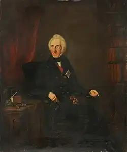Hotham was given command of the 64-gun HMS Raisonnable on 14 March 1803 and assigned to serve in the North Sea and the English Channel.[3][11] He was employed in the blockade of the invasion flotilla at Boulogne, but his health declined while on this service, and he resigned the command on 8 September 1803.[3] He came ashore, and on 12 June 1804 married Anne Jeynes, sister-in-law of Admiral Sir Edward Thornbrough.[3][8] On 25 May 1808 he returned to semi-active service commanding the Sea Fencibles at Liverpool. He held this position until 28 February 1810.[2][3] On 31 August 1812 he became commander of the yacht HMS Royal Sovereign, received a promotion to rear-admiral on 4 December 1813, and relinquished command of her on 2 April 1814.[2][3] He was offered the command of one or two dockyards, but declined them in the hope of being offered a command afloat. Nothing could be found for him however.[2][3] He became a gentleman-in-waiting at court, later writing a manuscript book entitled Characters, Principally Professional, and was one of the first appointments as Knight Commander of the Order of the Bath on the restructuring of the order on 2 January 1815.[12][13][14] He was advanced to vice-admiral on 19 July 1821, and to full admiral on 10 January 1837. He became a Knight Grand Cross of the Order of the Bath on 4 July 1840.[12] Sir William Hotham died at New Windsor, Berkshire on 31 May 1848 at the age of 76.[12][13] He was buried on 7 June in the family vault at Binfield, Berkshire.[4]