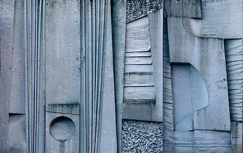- Abstract concrete mural above the entrance to the Turnpike Centre, Leigh, Greater Manchester (1971)[24][25]