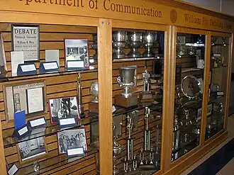 Trophy case of the William Pitt Debating Union, in the University of Pittsburgh Department of Communication, seen here on the former eleventh floor location (now 14th floor) of the Cathedral of Learning