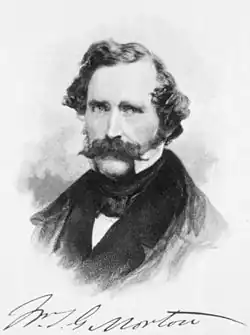 Born in Charlton, Massachusetts, William T. G. Morton was the son of James Morton, a miner, and Rebecca (Needham) Morton. William found work as a clerk, printer, and salesman in Boston before entering Baltimore College of Dental Surgery in 1840. In 1841, he gained notoriety for developing a new process to solder false teeth onto gold plates.[2] In 1842, he left college after graduating[3] to study in Hartford, Connecticut with dentist Horace Wells and Dr. Nathan Cooley Keep.[4] In 1843, Morton married Elizabeth Whitman of Farmington, Connecticut, the niece of former Congressman Lemuel Whitman. Her parents objected to Morton's profession and agreed to the marriage only after he promised to study medicine. In the autumn of 1844, Morton entered Harvard Medical School and attended the lectures of Charles T. Jackson, who introduced Morton to the anesthetic properties of ether. Morton then left Harvard without graduating.[3][4]