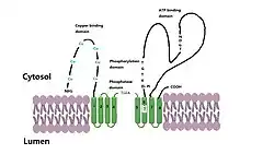 - ^ a b c Lutsenko S, LeShane ES, Shinde U (Jul 2007). "Biochemical basis of regulation of human copper-transporting ATPases". Archives of Biochemistry and Biophysics. 463 (2): 134–148. doi:10.1016/j.abb.2007.04.013. PMC 2025638. PMID 17562324.