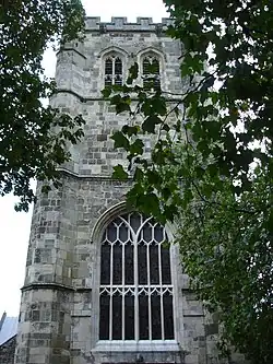 Since 1911 the west tower at the minster has been home to a ring of ten bells.[5] The original tenor bell was housed in the central tower and was cast in 1385. The central tower was considered too structurally weak to add much more additional weight, so in 1464 the west tower was constructed in order to house five bells.[5] In 1629 the tenor bell was recast. Besides the tenor, the minster at this time was home to the 'Bell of St. Cuthburga', 'The Fyfer Bell', 'The Jesus Bell' and 'The Morrow Mass Bell'; presumably all housed in the west tower.[5] In 2012, the bells were augmented to 12 by Whitechapel Bell Foundry, with an additional semitone bell cast to make a total of 13 bells.[6]