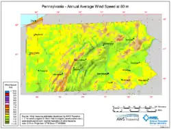 In the U.S. state of Pennsylvania, wind power is one of the primary sources of renewable energy, and accounts for over one third of the state's renewable energy production.[1] There are more than 27 wind farms currently operating in the Commonwealth of Pennsylvania. Theoretically, the energetic development of these wind farms could provide power for nearly 350,000 homes, or 1,300 megawatts.[2] A majority of the farms are located in the southwest-central and northeastern regions of the state.[3] Pennsylvania is an East Coast leader in wind energy due to its natural wind resources and governmental incentives brought on by the state. There is a lot of potential for growth within the wind power industry in Pennsylvania and the Northeast. Despite being one of the few landlocked states in the Mid-Atlantic region, Pennsylvania is close to several offshore sites along the coast of the Atlantic Ocean.