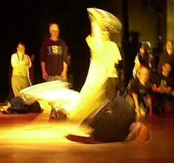 The Windmill (or briefly Mill) is a popular breakdancing move. The breaker rolls their torso continuously in a circular path on the floor, across the upper chest/shoulders/back, while twirling their legs in a V-shape through the air.[1]