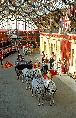 After leaving the platform, visitors could see the restored royal waiting room with figures of Queen Victoria and the Prince and Princess of Wales, before entering 'The Royal Parade' area. A walkway was constructed up and around the canopy, allowing visitors to view figures of the royal party exiting the waiting room and the queen boarding her Ascot landau. More than seventy wax figures of soldiers of 2nd Battalion Coldstream Guards formed part of this scene.[15]