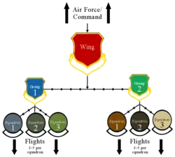 In military aviation, a wing is a unit of command. In most military aviation services, a wing is a relatively large formation of planes. In Commonwealth countries a wing usually comprises three squadrons, with several wings forming a group (around 10 squadrons). Each squadron will contain around 20 planes.