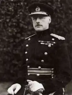 He later fought with distinction in the First World War, where he was wounded and mentioned in despatches six times. He was promoted in July 1916 to the temporary rank of brigadier general[6] and commanded the 61st (2nd South Midland) Division's 184th (2nd South Midland) Brigade on the Western Front.[7] He was awarded the Distinguished Service Order (DSO) in 1915 and appointed a Companion of the Order of St Michael and St George (CMG) in 1918.