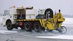 The surface friction tester is a small fifth wheel attached to a hydraulic system mounted on the rear axle of the vehicle, used to measure road slipperiness. The wheel, allowed to roll freely, is slightly turned relative to the ground so that it partially slides. Sensors attached to the axis of the wheel calculate the friction between the wheel and the pavement by measuring the torque produced by the rotation of the wheel. Surface friction testers are used at airports and on major roadways before ice formation or after snow removal.[58][59] The vehicle can relay the surface friction data back to the control centre, allowing gritting and clearing to be planned so that the vehicles are deployed most efficiently.[60] Surface friction testers often include a water spraying system, to simulate the effects of rain on the road surface before the rain occurs.[58] The sensors are usually mounted to small compact or estate cars or to a small trailer, rather than the large trucks used for other winter service equipment, as the surface friction tester works best when attached to a lightweight vehicle.[58][61][62]