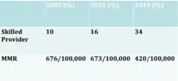 Good progress has been registered in maternal mortality reduction, a 69% reduction according to UN estimates from the 1400/100000 live births in 1990 to 420/100,000 live births in 2013.[2]