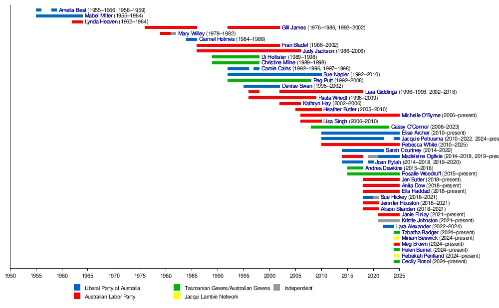 Christine Milne and Di Hollister were the first women elected to represent the Greens in 1989. Kristie Johnston was the first independent woman elected in 2021, although Mary Willey, Madeleine Ogilvie and Sue Hickey had served as independents after leaving their parties. Kathryn Hay was the first Indigenous woman elected to the Tasmanian parliament in 2002.