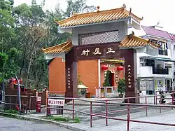 The present Wong Uk Village. The Wong Clan ancestral hall is visible behind the paifang. An Earth God shrine is visible on the left.