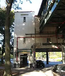 Between the towers is a two-story span. Its lower level, the mezzanine, is faced in concrete and divided into three sections divided by square pilasters. All have a recessed triple casement window; that in the central portion is flanked by two similar double windows. Traffic lights are mounted on the west side and western portion of the central section below window level. At the top of each pilaster is a mosaic tile. A smooth metal strip runs across the top. Above it is an apparent second story, sided in the vertical plywood that shelters the platform. It is recessed slightly from the mezzanine, with its fenestration echoing that below.[5]