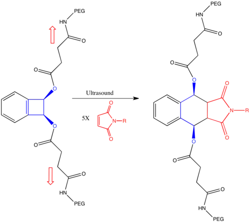 Similarly, a recent paper describes how mechanical stress can be used to reshape chemical reaction pathways to lead to products that apparently violate Woodward–Hoffman rules.[37] In this paper, they use ultrasound irradiation to induce a mechanical stress on link-functionalized polymers attached syn or anti on the cyclobutene ring. Computational studies predict that the mechanical force, resulting from friction of the polymers, induces bond lengthening along the reaction coordinate of the conrotatory mechanism in the anti-bisubstituted-cyclobutene, and along the reaction coordinate of the disrotatory mechanism in the syn-bisubstituted-cyclobutene. Thus in the syn-bisubstituted-cyclobutene, the anti-WH product is predicted to be formed.