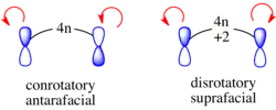 In the intervening four years, Howard Zimmerman[3][4] and Michael J. S. Dewar[5][6] proposed an equally general conceptual framework: the Möbius-Hückel concept, or aromatic transition state theory. In the Dewar-Zimmerman approach the orbital overlap topology (Hückel or Möbius) and electron count (4n + 2 or 4n) results in either an aromatic or antiaromatic transition state.