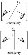 - ^ Although the figure below shows both ends rotating clockwise, it is important to recognize that orbital symmetry only distinguishes between rotation in the same direction or opposing directions (conrotation vs. disrotation). The formation of the (Z,Z) isomer from ring opening of 1 (both ends rotating counterclockwise) is therefore also symmetry allowed. That the (Z,Z) isomer was not observed is likely due to unfavorable steric interactions between the inwardly rotating methyl groups. (In other cases, the preference for clockwise or counterclockwise bond rotation may be controlled by stereoelectronic factors: see torquoselectivity.)
