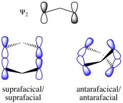 The Woodward–Hoffmann rules can also explain bimolecular cycloaddition reactions through correlation diagrams.[26] A [πp + πq] cycloaddition brings together two components, one with p π-electrons, and the other with q π-electrons. Cycloaddition reactions are further characterized as suprafacial (s) or antarafacial (a) with respect to each of the π components. (See below "General formulation" for a detailed description of the generalization of WH notation to all pericyclic processes.)