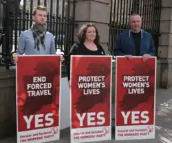 The party retains a tradition of secularism. In April 2017, Councillor Éilis Ryan organised a demonstration against the proposed control of the new National Maternity Hospital by the Religious Sisters of Charity.[52] The Workers' Party campaigned for a yes vote in the referendum to repeal the Eighth amendment in May 2018, having been the only party in the Dáil to oppose the introduction of the Eighth amendment in 1983.[53]