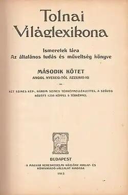 The World lexicon of Tolnai (Hungarian "Tolnai világlexikona"), after a long preparatory work, was first published in 1912, when only 8 volumes were published. The publication of additional volumes that had already been prepared was prevented by the First World War, largely rendering obsolete the contents of the published and still edited volumes of the series.