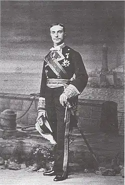 In Portugal, Grant visited Lisbon where he and Julia were received by King of Portugal Don Luís I and Queen of Portugal Maria Pia of Savoy.[77] Luís I drew Grant into a private apartment away from people and discussed trade between the United States and Portugal.[78] The King believed the port of Lisbon, after a new Spanish-Portuguese railway was built, would offer the United States produce and manufactures business opportunities. Grant attended the King's royal birthday the following day.[79] Grant refused to take the Grand Cross of the Tower and Sword, an offered gift from the King, saying that although he was an ex-president, he could not accept decorations. Before leaving Portugal Grant also visited with the King's father Don Fernando.[80] On December 12, Grant once again returned to Paris.[56]