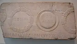 Besides sacrificial rituals, festival rites of marriage, birth, and death all involved wreaths.[1] As in Catullus's Poem 61 and Apuleius's The Golden Ass, couples to be married were both wreathed on the occasion.[1][8][9] To mark the occasion of a new birth, the household would hang a wreath of olive or wool on the door.[1] As part of ancient funerary practice, the dead were wreathed, funerary urns were wreathed, and wreaths were lain on and within tombs. Euripides's The Trojan Women, Athenaeus's Deipnosophistae, and Pliny's Natural History all include references to the dead as wreathed, while Pliny even mentions a raven, celebrated talking as a talking bird, being awarded wreaths at its lavish funeral.[1][10][11][12] Funerary monuments might be painted with wreaths as well as hung with them, and from the Hellenistic period, wreaths awarded to the deceased during a lifetime could be carved on the monument marking the grave.[1]