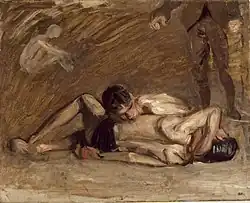Wrestlers is a name shared by three closely related 1899 paintings by American artist Thomas Eakins, (Goodrich catalog #317, #318, #319). The Los Angeles County Museum of Art (LACMA) owns the finished painting (G-317), and the oil sketch (G-318). The Philadelphia Museum of Art (PMA) owns a slightly smaller unfinished version (G-319). All three works depict a pair of nearly naked men engaged in a wrestling match. The setting for the finished painting is the Quaker City Barge Club (defunct), which once stood on Philadelphia's Boathouse Row.[1]