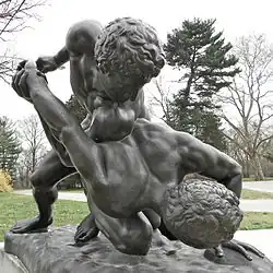 The two young men are engaged in the pankration, a kind of wrestling similar to the present-day sport of mixed martial arts. The two figures are wrestling in a position now known as a "cross-body ride" in modern folkstyle wrestling. The upper wrestler has his left leg entwined with his opponent's left leg, with his body across the opponent's body, lifting the opponent's right arm.[1] In a well-known modern series of wrestling moves, the upper wrestler would now try to lift his opponent's arm above his head to force a pinning move called the "Guillotine."[2] Their muscular structure is very defined due to their physical and sustained effort.