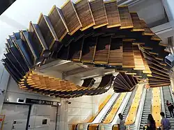 Commencing in 2015, the platforms and concourse were thoroughly refurbished with new flooring and ceilings as well as an extra stairway to platforms 3 and 4 and the addition of more ticket barriers. The four wooden escalators underneath Transport House, which had been operational since the opening of the station, were replaced with modern escalators. Parts of the former escalators were repurposed into a ceiling-mounted artwork titled 'Interloop', which was installed at the York Street entrance to the station concourse.[7][8] The refurbishment was completed in 2018.[9]