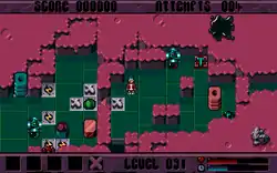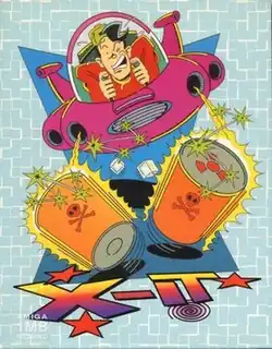 X-It was created by Data Design Interactive (DDI), a British game developer which had previously worked for publisher Millennium Interactive on Pinkie.[6][7] The game was produced by Greg Duddle.[5] It was designed and programmed by a team within DDI called Flatline;[3] Richard Hackett and Stephen Bond came up with the game's concept and acted as co-designers.[1][5] David Hackett, Marcus Stringer, and Richard Hackett also provided additional level design.[5] Marcus Stringer was responsible for the graphic design, while Dale Johnstone was in charge of the rendered sequences.[5] The soundtrack was composed by Darren Wood.[5] Several staff members collaborated in the game's development process as well.[5] The game was first published in Europe by Psygnosis for the Amiga in November 1994 (although December is also listed as release date).[4][8] An MS-DOS version was also released by Psygnosis that year.[7][9] The game was known as Zonked in early previews, and major gaming publications reviewed it as Zonked.[3][10][11][12][13] The Amiga version was also distributed in Australia by Hot Point.[14] In 2006, a fan remake for Microsoft Windows titled X-It Again was released as freeware by Jay Parker of Finnish group Puzzlehouse.[15][16]