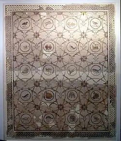 The xenia motif in Roman mosaic is a still life motif consisting of a grouping of various items, mostly edible, representing a generous offering (a xenia) from a wealthy host to guests. The items are often spread across different compartments in floor mosaic schemes. No doubt there were once paintings, but these have been lost.