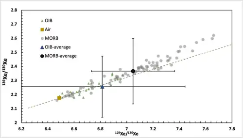 The deviations in 129Xe/130Xe ratio between air and MORBs show that mantle degassing occurred before 129I was extinct, otherwise 129Xe/130Xe in the air would be the same as in the mantle.[45][46] The differences in the 129Xe/130Xe ratio between MORBs and OIBs may indicate that the mantle reservoirs are still not thoroughly mixed. The chemical differences between OIBs and MORBs still await discovery.[11]