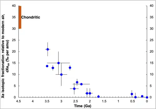 - ^ a b c d e Avice, G.; Marty, B.; Burgess, R.; Hofmann, A.; Philippot, P.; Zahnle, K.; Zakharov, D. (2018). "Evolution of atmospheric xenon and other noble gases inferred from Archean to Paleoproterozoic rocks". Geochimica et Cosmochimica Acta. 232: 82–100. Bibcode:2018GeCoA.232...82A. doi:10.1016/j.gca.2018.04.018. S2CID 55982250.