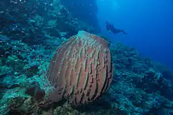 This species is found in the Philippines,[2] Australia,[1] western and central Indian Ocean, Indonesia, Malaya and New Caledonia. These sponges are sessile filter feeders, with a very important role in the ecosystem. Giant Barrel Sponges filter a tremendous amount of water throughout their lifespan (some living up to 2000 years) which increases water clarity, controls algae, and affects coral populations. These sponges also serve as a habitat for many other species such as other invertebrates, benthic fish, bacteria, and cyanobacteria.