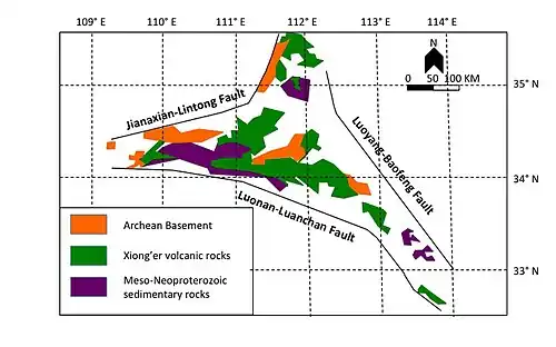 The Xiong'er Volcanic Belt (Chinese: 熊耳群火山岩; pinyin: Xióng'ěr qún huǒshānshí) is a 1770 to 1800 million year-old group of volcanic rocks located on the southern edge of the North China craton (Figure 1).[1][2][3] It covers an area of approximately 60,000 km2 and varies from 3000 m to 7000 m thick.[1][3][4] The perimeter of the volcanic belt is composed of three faults: the Jianxian-Lintong fault to the northwest, the Luoyang-Baofeng fault to the northeast, and the Luonan-Luanchan fault to the south (Figure 2).[2][3] The volcanic belt formed at a time in Earth's history when all of the continents were joined forming the Supercontinent Columbia, the earliest known supercontinent.[5] The Xiong'er Volcanic Belt is very important because it can provide valuable information to help piece together the formation and breakup of the Supercontinent Columbia and the North China craton by identifying what type of boundary was located on the southern edge of the North China craton.[1][2]